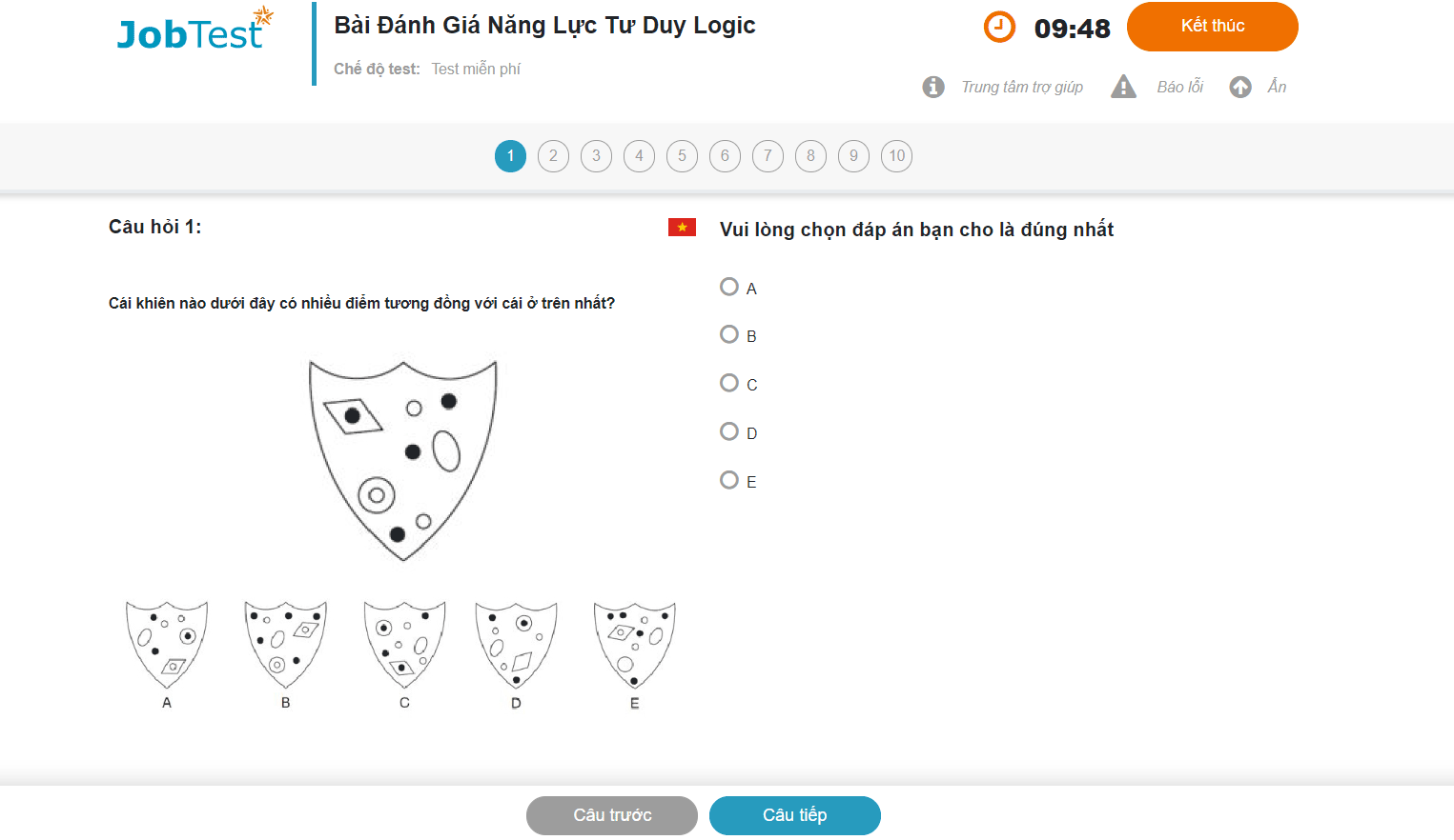 Hiện tại JobTest đang cung cấp cho bạn trọn bộ bài test đánh giá tư duy Logic phù hợp với từng cấp độ mà bạn mong muốn. Bạn có thể trải nghiệm miễn phí bài test khả năng tư duy Logic của JobTest để hiểu rõ hơn về dạng trắc nghiệm này.