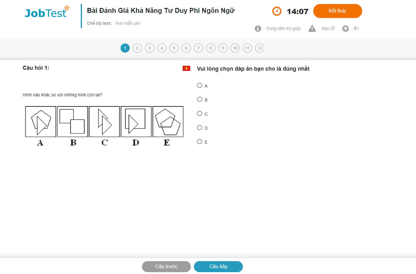 Cách đơn giản nhất chính là thực hiện bài trắc nghiệm khả năng tư duy phi ngôn ngữ online ngay trên nền tảng của JobTest. Bài test tư duy phi ngôn ngữ sẽ kiểm tra tư duy trừu tượng của bạn. Đây là công cụ được thiết kế để đánh giá và đo lường các kỹ năng tư duy bên trong của mỗi cá nhân, hay con gọi là “trí thông minh mềm”.