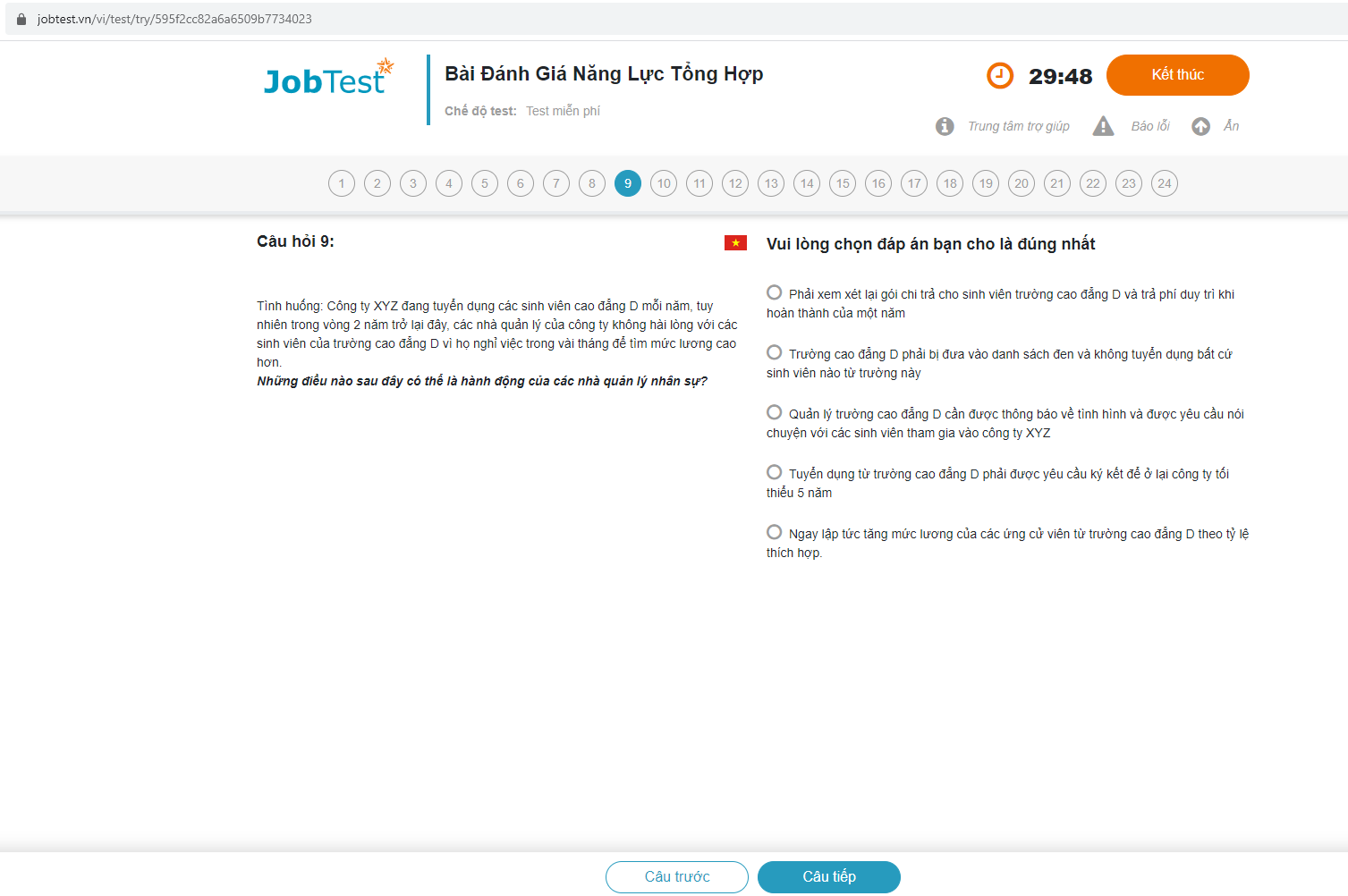 Bài test năng lực tổng hợp của JobTest là dạng bài đánh giá tổng quát chuẩn quốc tế được dẫn nguồn trực tiếp từ IBM - Kenexa và chuẩn hoá sang ngôn ngữ tiếng Việt. Các câu hỏi được thể hiện trong bài Test sẽ đánh giá người thực hiện ở nhiều kỹ năng. Bài báo cáo kết quả sau khi được thực hiện sẽ giúp nhà tuyển dụng phân tích chuyên sâu và cho thấy năng lực nổi trội của họ và những khả năng họ cần cải thiện. Doanh nghiệp bạn có thể trải nghiệm miễn phí bài test năng lực tổng hợp trên nền tảng JobTest trước khi ứng dụng vào quy trình tuyển dụng và đánh giá năng lực của nhân viên tại công ty.