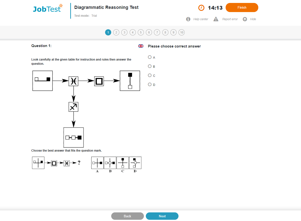 Diagrammatic reasoning tests are closely related to abstract reasoning tests. They are used to select information technology specialists who need to work through complex abstract problems in an analytical way. The questions consist of flowcharts or process diagrams, and measure your ability to follow a series of logical instructions or to infer rules presented using symbols. These types of questions can appear in other types of test but they are particularly suited to information technology jobs because they closely mirror the way in which analysts and programmers approach software design. As such, they could be thought of as a work sample test that is independent of any particular technology or programming language.