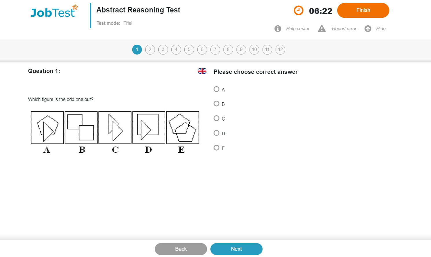 Test Structure: The abstract reasoning test consists of 12 questions with patterns, figures, images and the duration is 15 minutes.